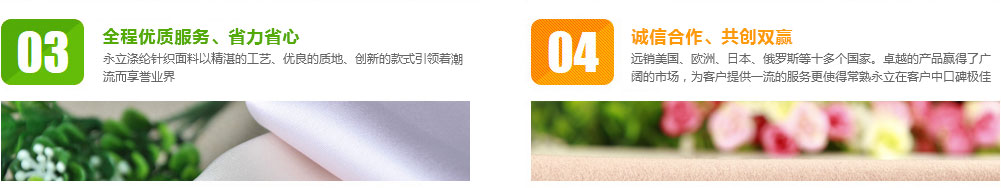 公司成立于1997年,坐落于風景秀麗的虞山腳下,位于中國經(jīng)濟最活躍的版圖--長江三角洲經(jīng)濟技術開發(fā)區(qū)的黃金地段上,常熟市永立針紡織有限公司,伴隨著中國針紡織品行業(yè)蓬勃發(fā)展,走過了10多年的創(chuàng)業(yè)歷程,如今已發(fā)展成為一家集工、貿于一身,在行業(yè)內聞名遐邇的專業(yè)生產(chǎn)滌綸針織面料的特色企業(yè)。本公司擁有來自臺灣的先進制造設備,以雙面小提花機為主的34寸(16--45針)雙面緯編機50臺、34寸(20--50針)單面開幅機9臺、36寸 22針德國邁耶OVJE雙面電腦大提花機6臺及其他先進設備。憑借著一流的設備,以及“人無我有,人有我好,人好我轉”的經(jīng)營理念,常熟永立一直致力于滌綸面料的創(chuàng)新...